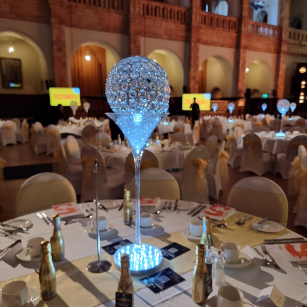 Give your event a real wow factor with our range of LED illuminated martini glass centrepieces to hire. All martini glass centrepieces include illumination on our super bright led 8” bases with a choice of white or coloured LED lighting plus optional table mirrors to reflect even more light. If you have a particular theme then we can design a centrepiece specially for you so please ask. Our last event for martini glass table centrepieces was at The Great Hall, Birmingham University for the EDF awards event using our illuminated crystal globes on top of the martini glass vases.