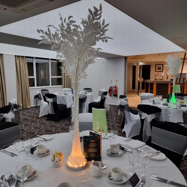 Choose from a range of tall centrepieces such as our crystal trees with uplighting, ostrich feather displays in lily vases or martini vases, mirrorball centrepieces, crystal table chandeliers and crystal candleabras. If you are looking for a lower table centrepiece then choose from our bubble bowls filled with silver wire balls which can then be illuminated in many different colours, crystal balls, moon balls, crystal cones and our star lamps.