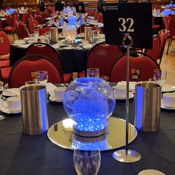 Choose from our moonballs, crystal cones, crystal globe centrepieces, gold mirrorballs, bubble ball bowls, star centrepieces and many more. Our latest set up was for 33 bubble ball bowls at the Great Hall, Birmingham University.